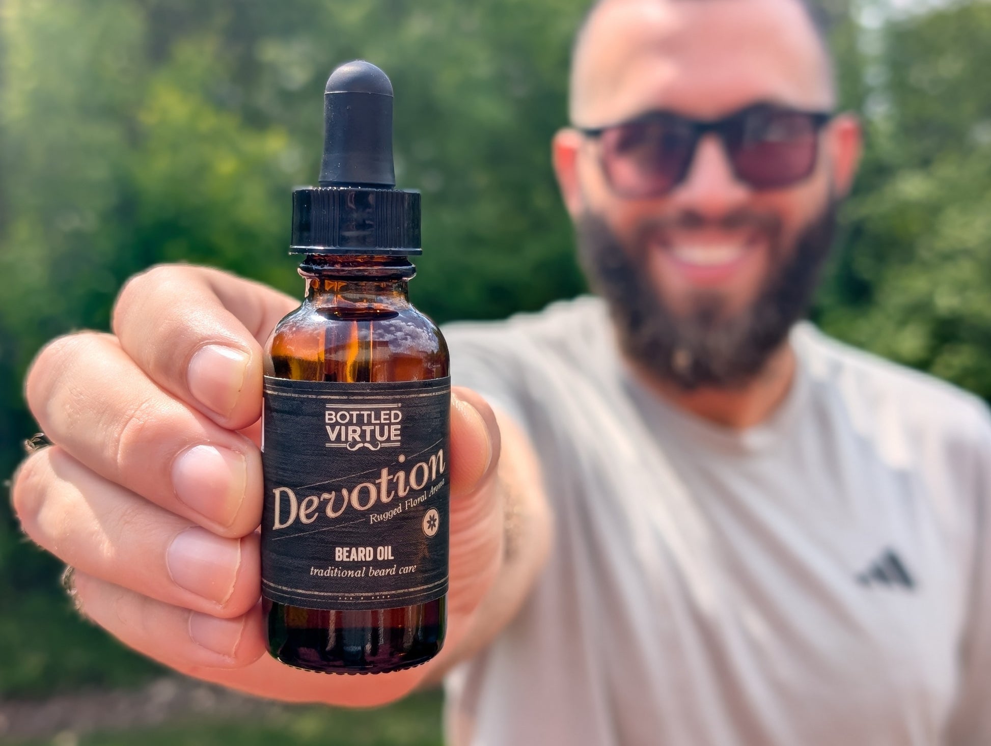 You’ll receive a one-ounce bottle of beard oil in an amber glass bottle with a dropper-top. The amber tint helps reduce exposure to UV, keeping our oil fresher longer. We use BOPP water and oil-proof labels that will not fade or disintegrate, designed for practical everyday hands-on use.